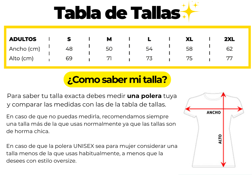 Cada polera se elabora individualmente una vez realizada la compra, por lo que no disponemos de stock inmediato.